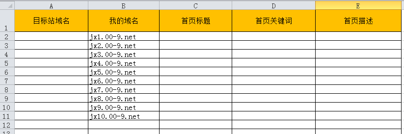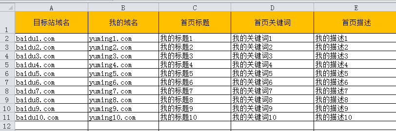 分别是:目标站域名,我的域名,首页标题,首页关键词,首页描述。