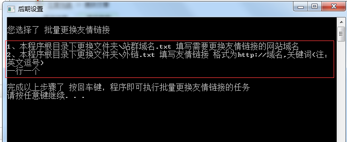 一、打开程序根目录。后期设置大全.exe。输入“3” 批量更换友情链接